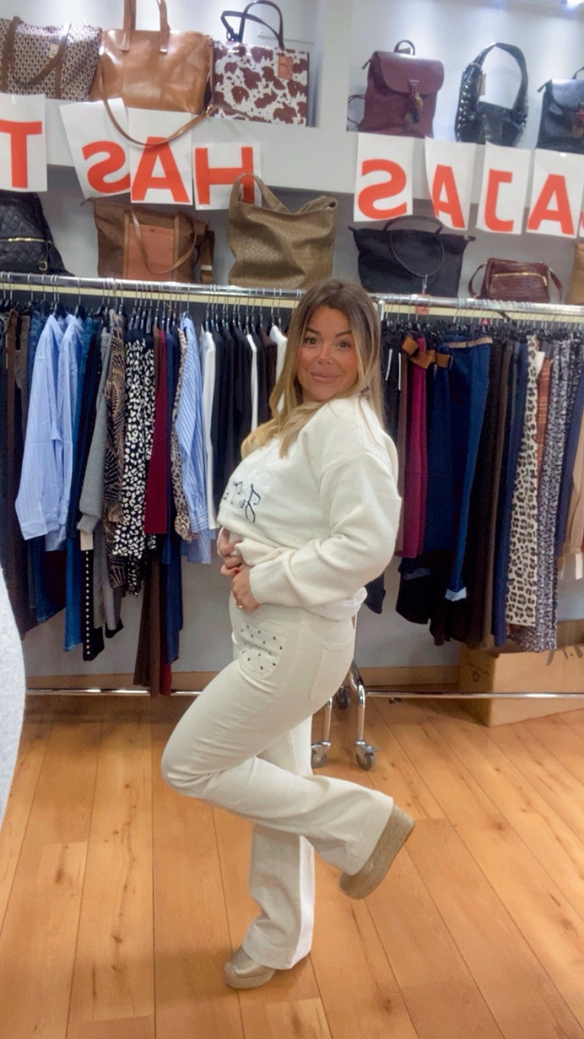Pantalón elástico con tiro alto , y detalles en los bolsillos