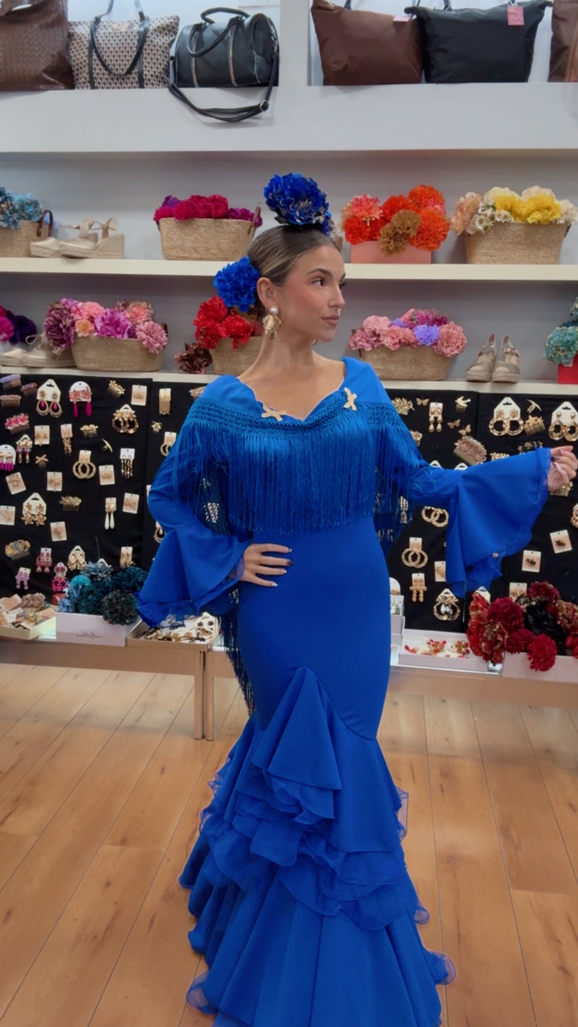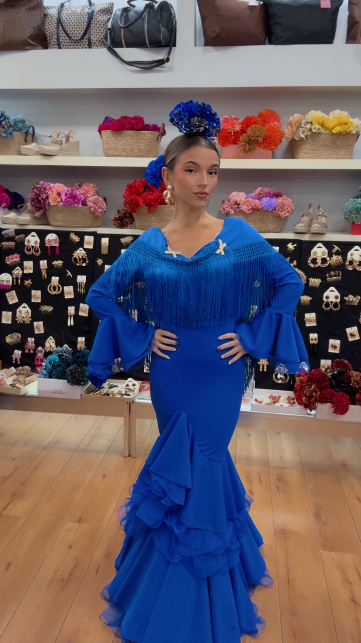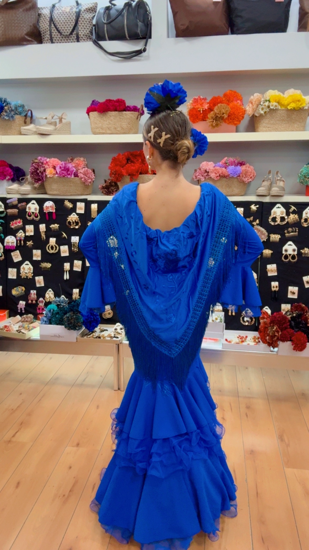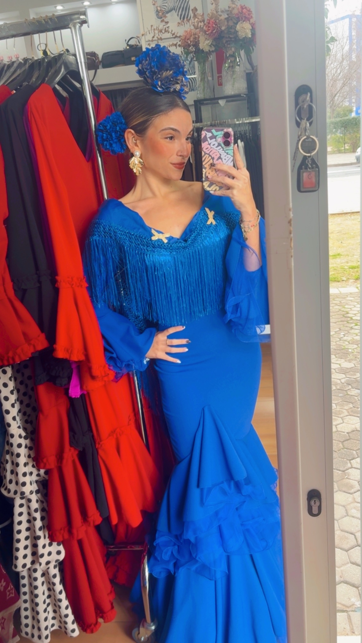 Vestido de crespón elástico con detalles de tul en volantes, falda y mangas. En la foto la modelo lleva enaguas,no va incluida en el precio.no tiene cambio ni devolución