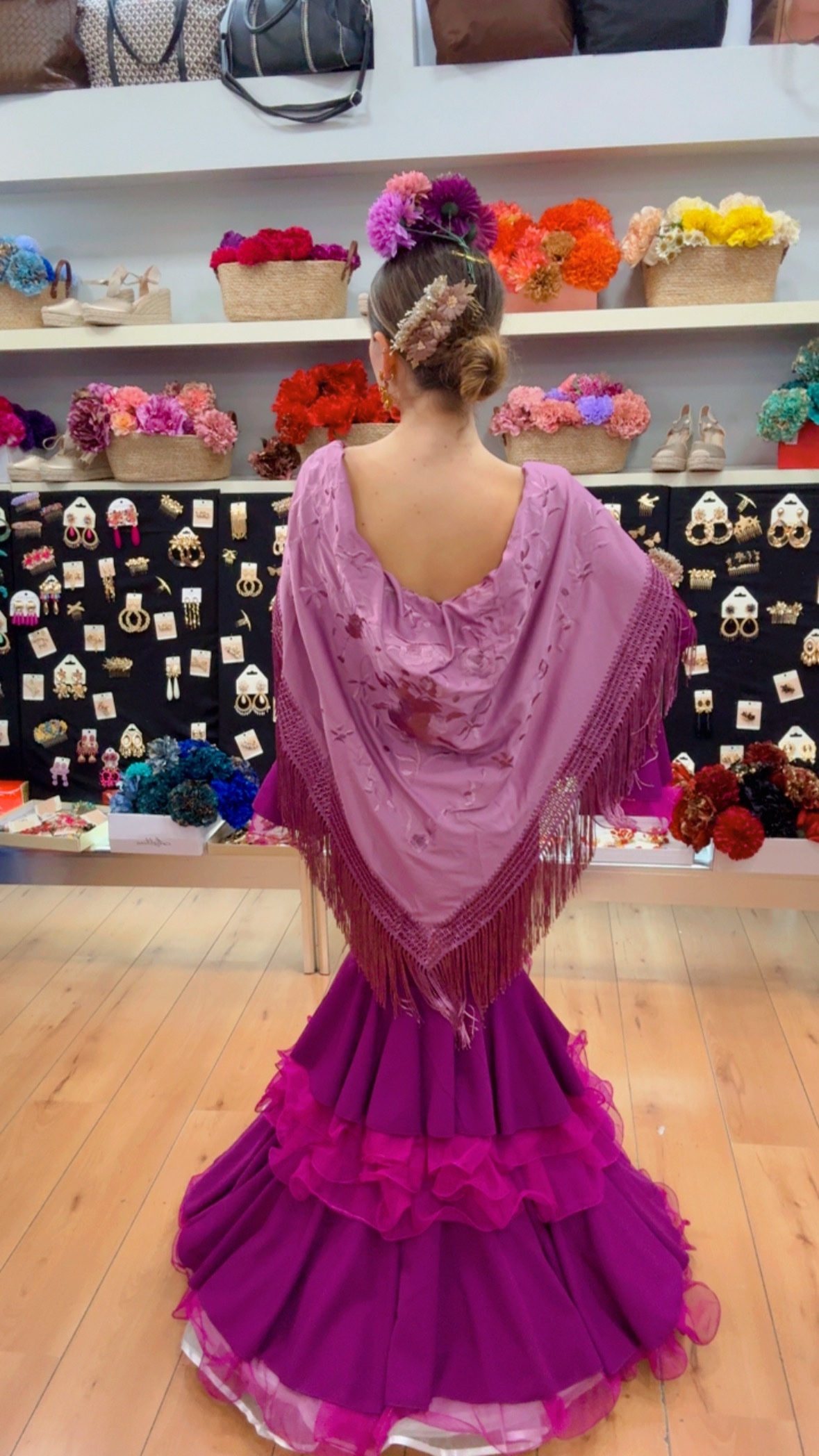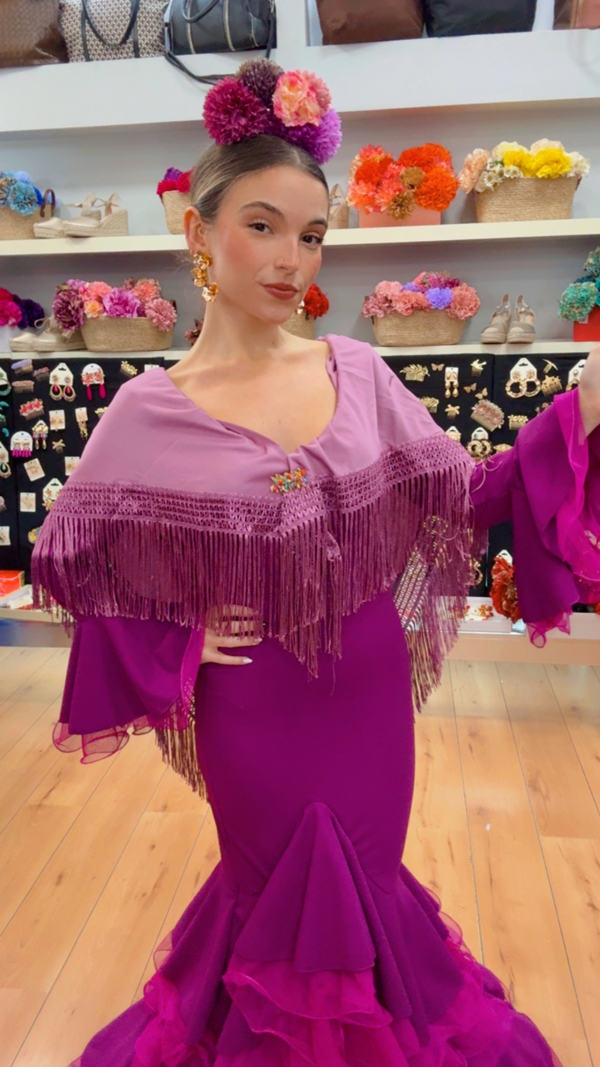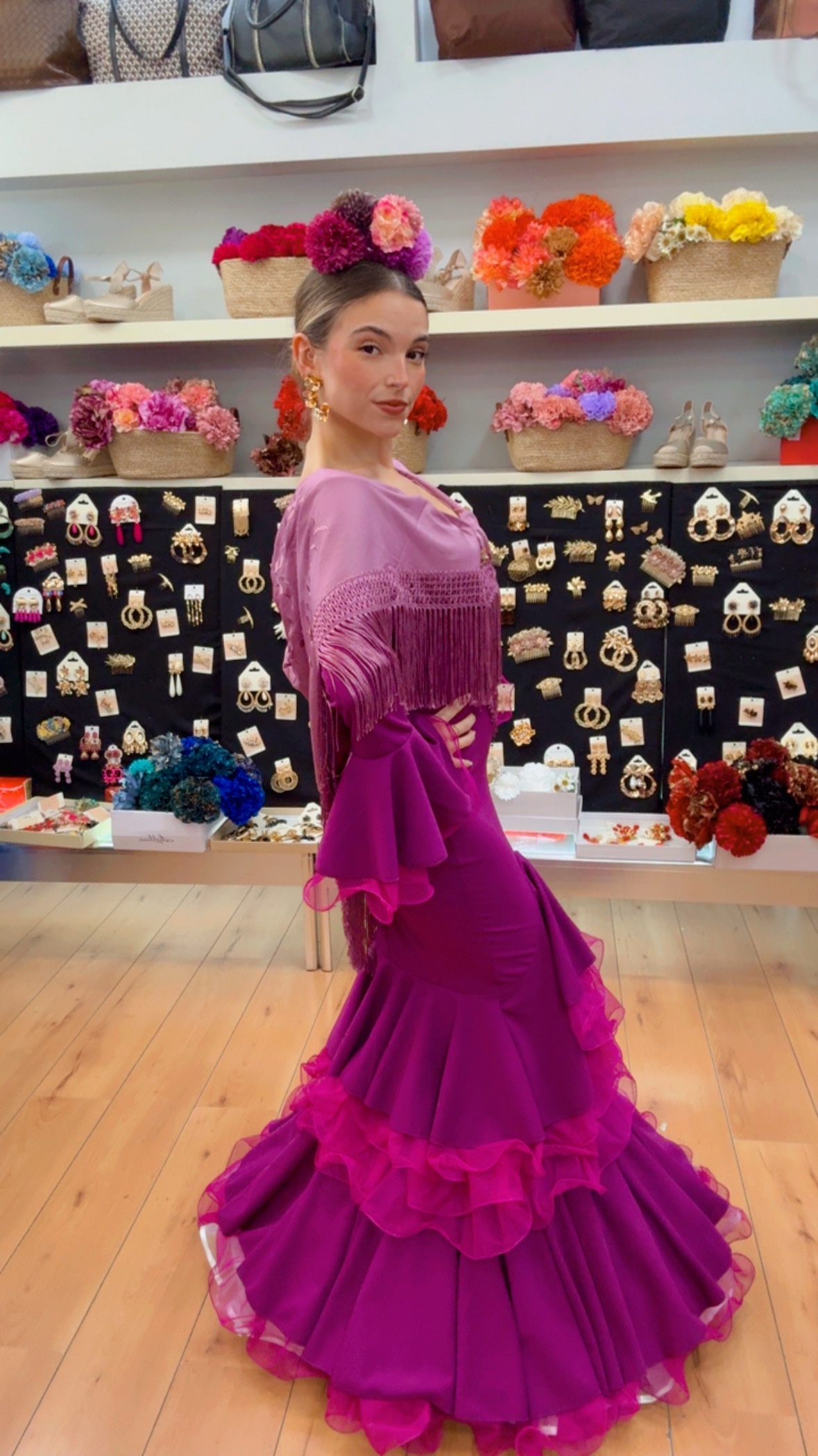 Vestido de crespón elástico en color buganvilla , con volantes de tull en mangas y falda . (En la foto lleva el cancán con aro )No tiene cambio ni devolución