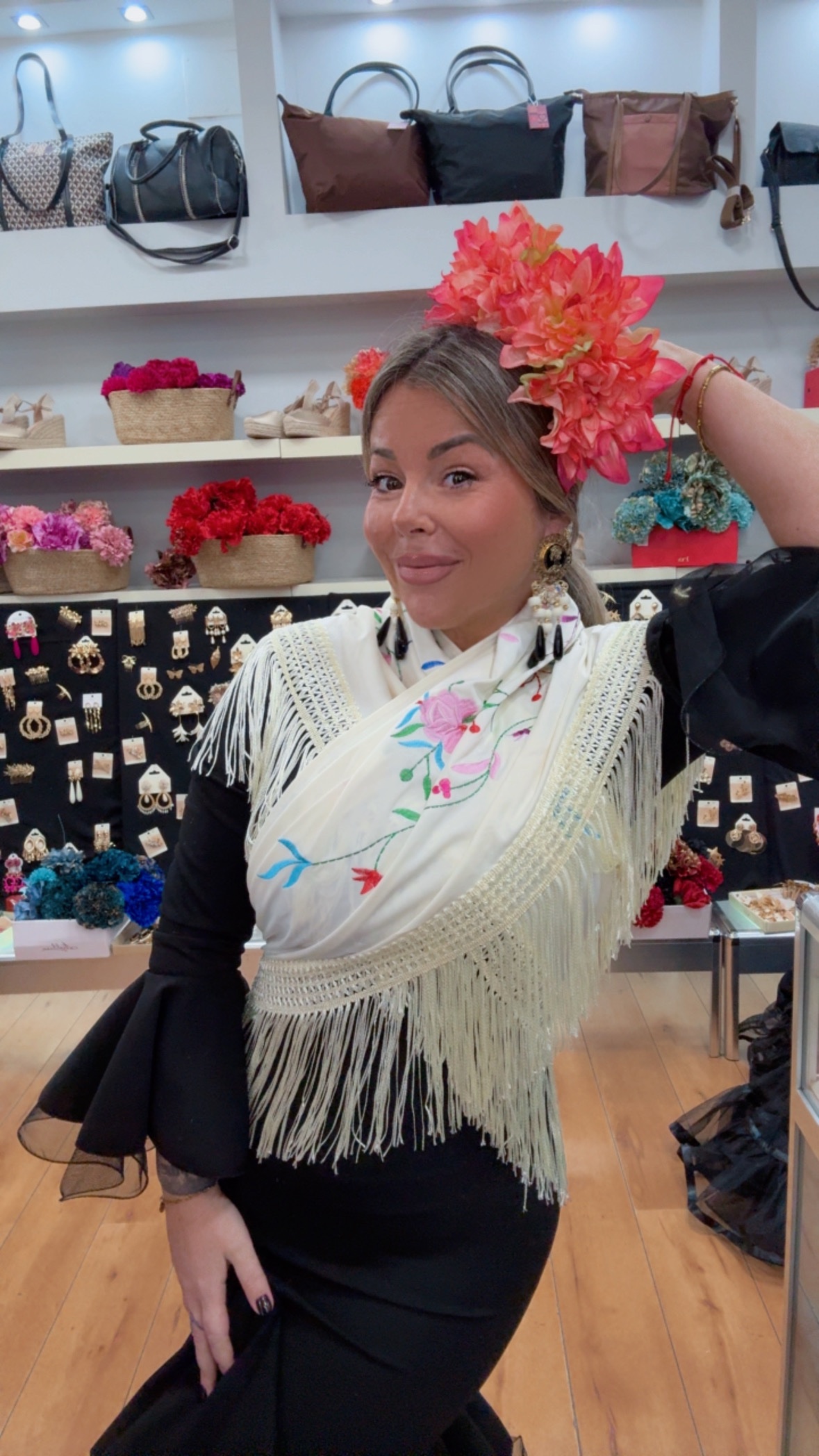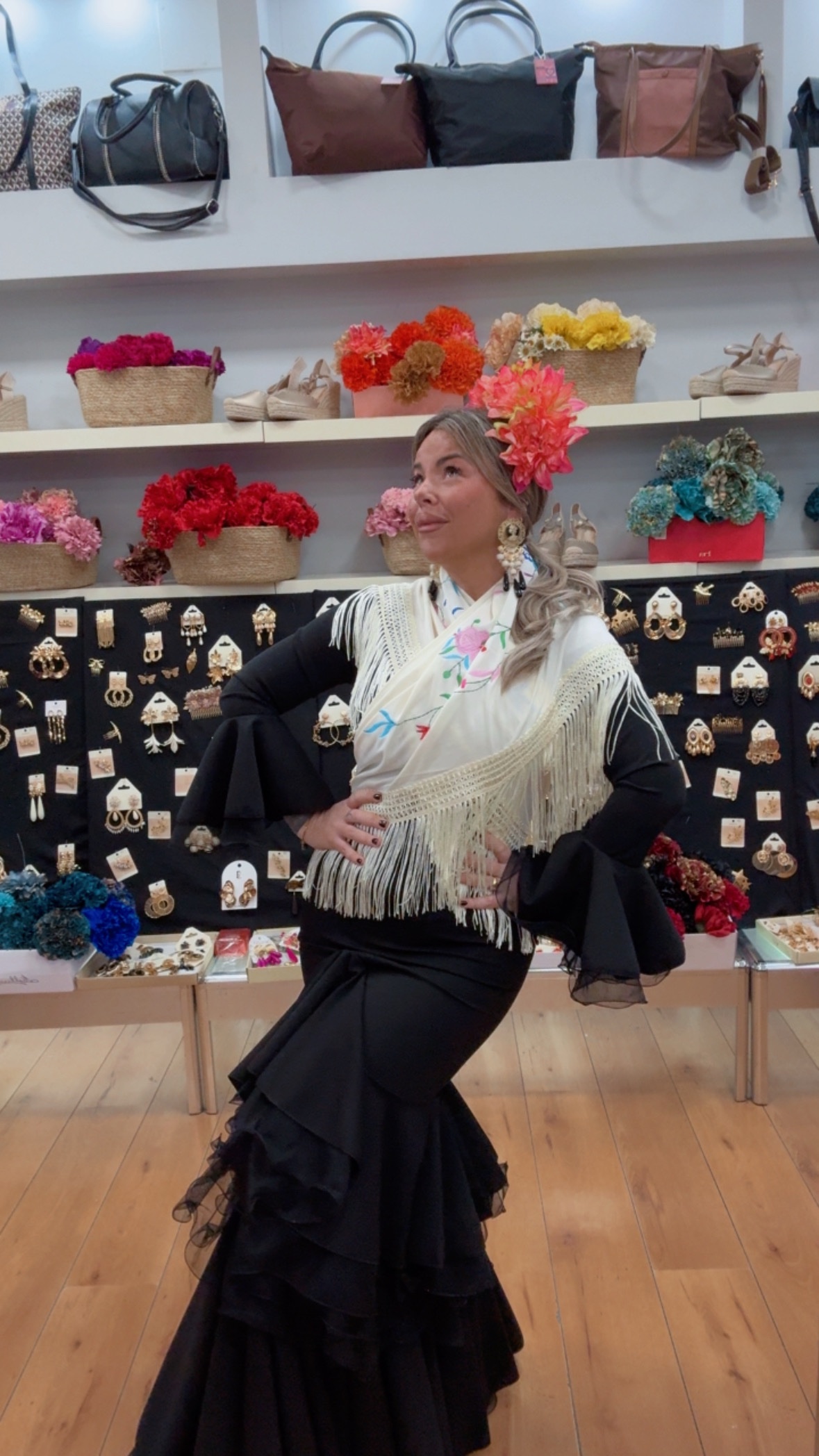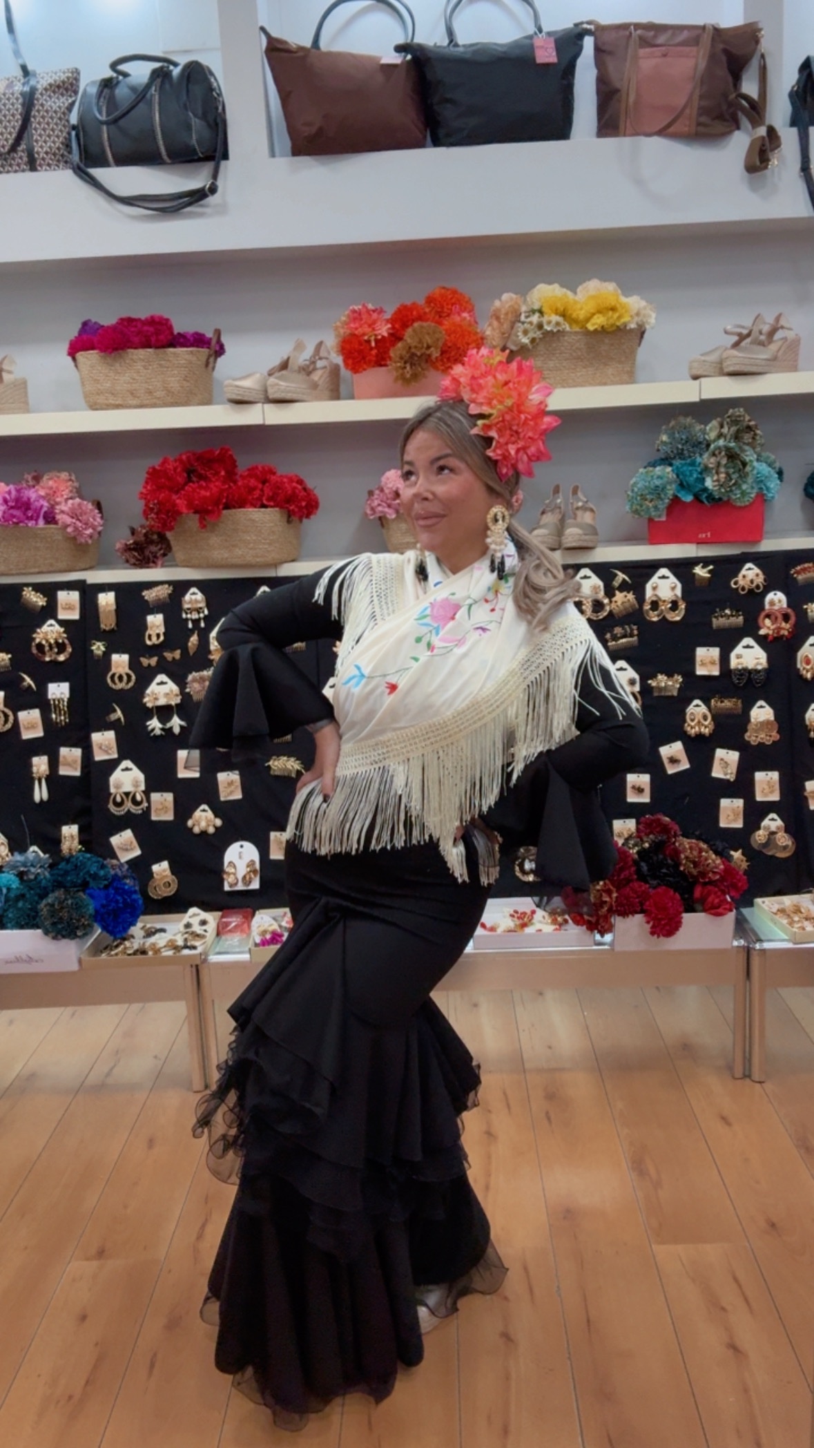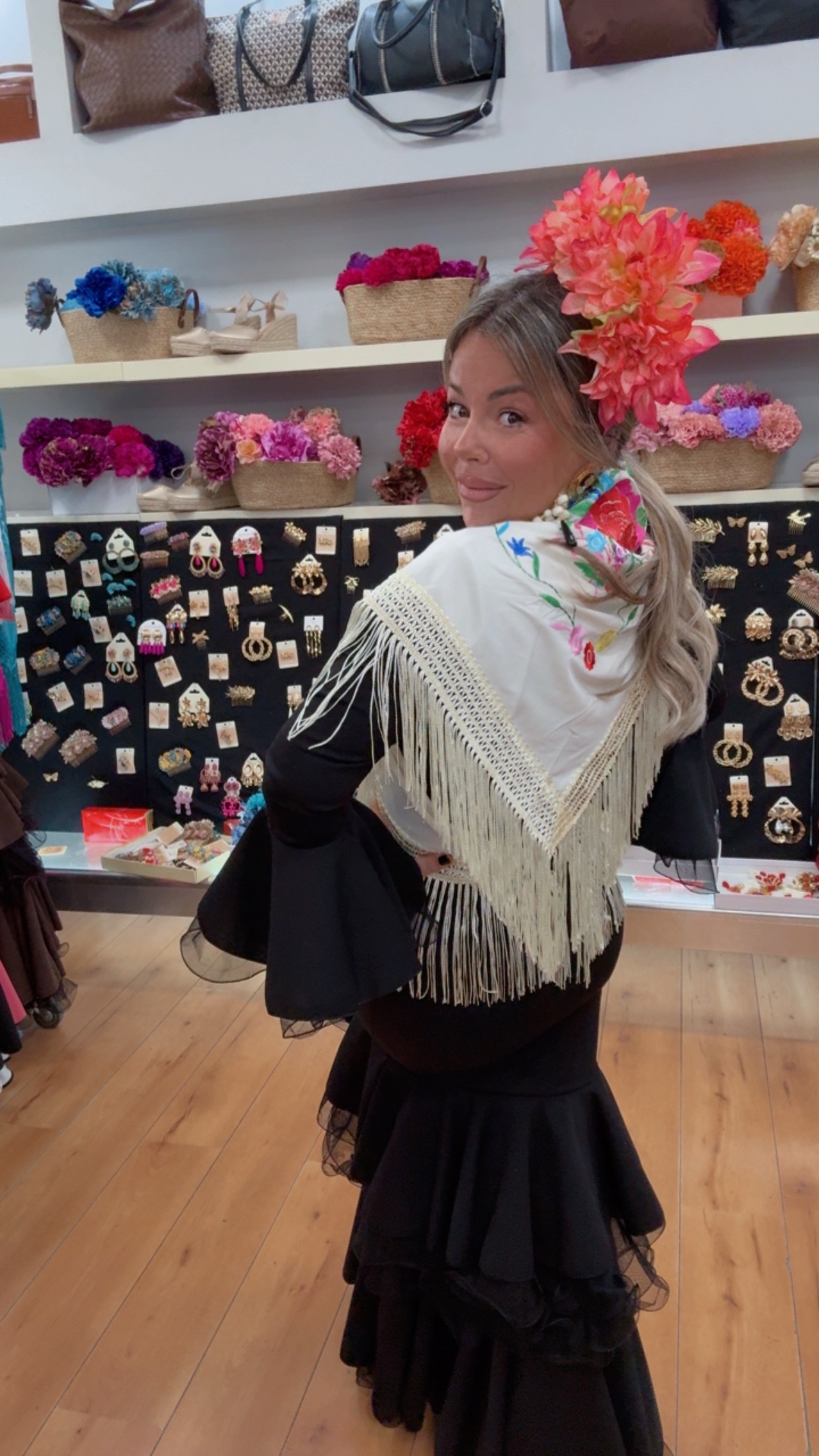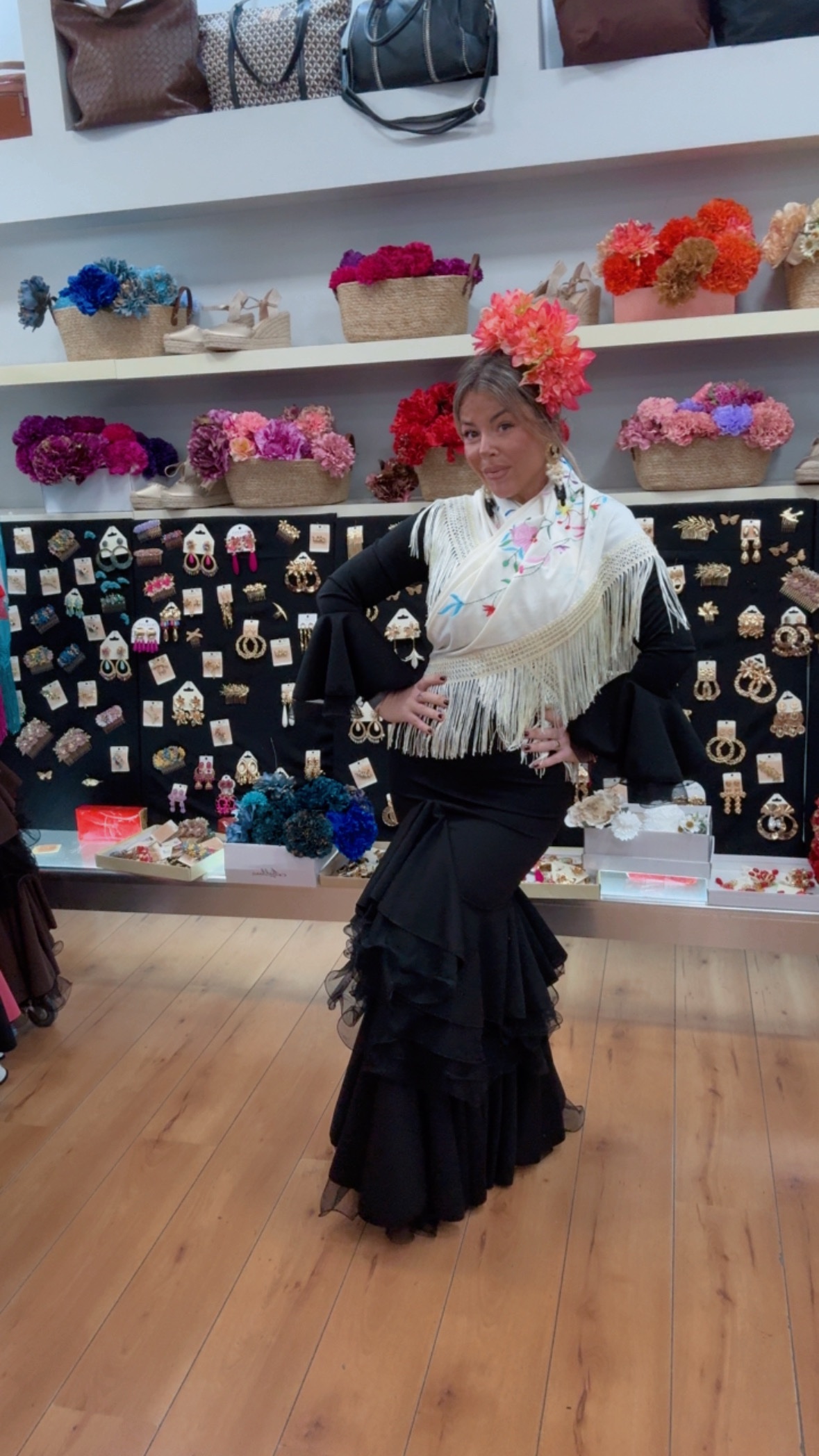 Vestido de crespón elástico con detalles de tul en volantes de mangas y falda. En la foto no lleva enaguas. No tiene cambio ni devolución