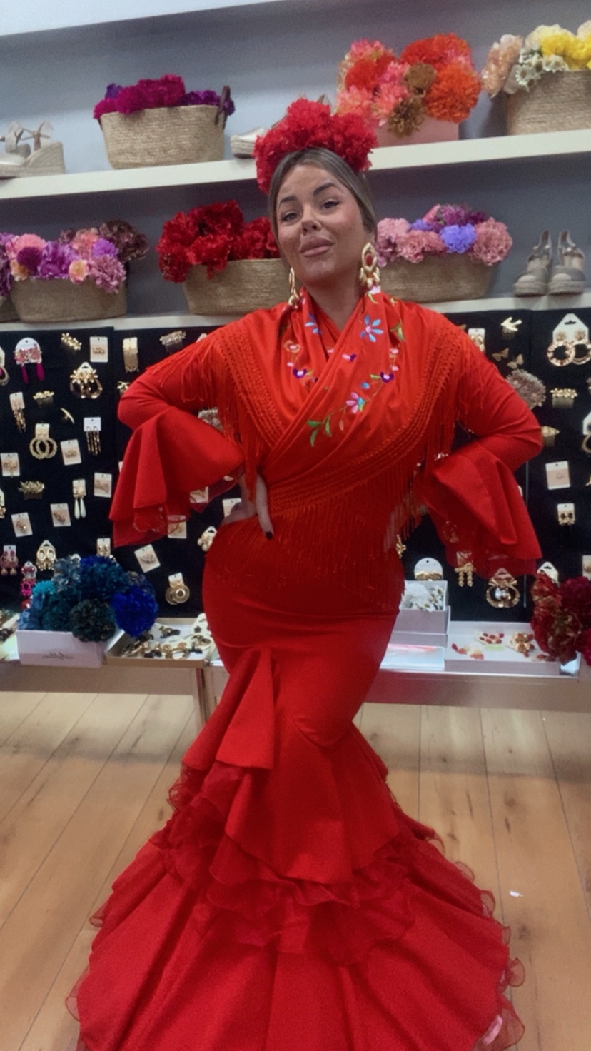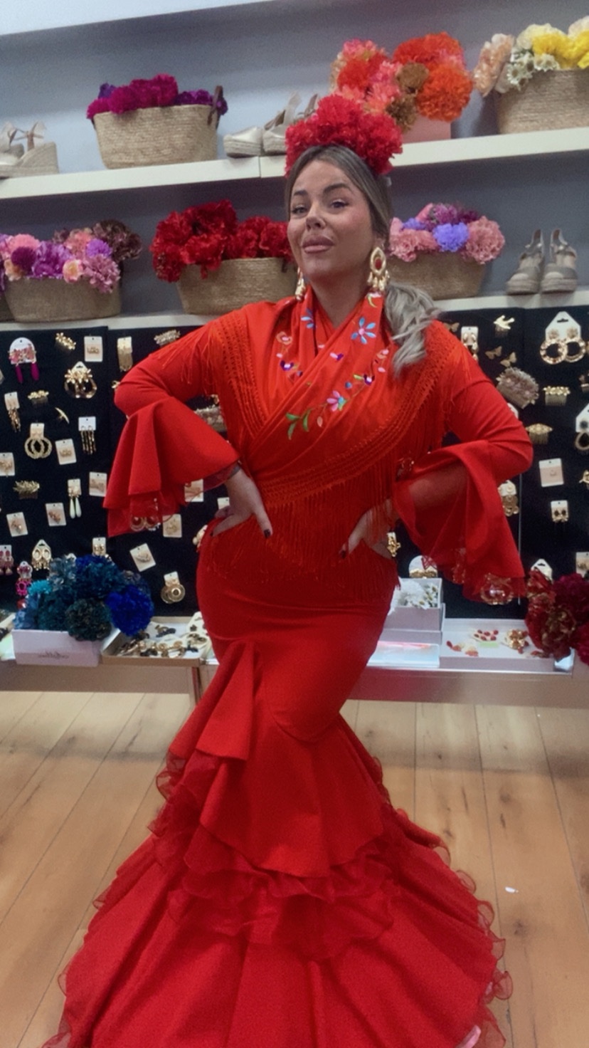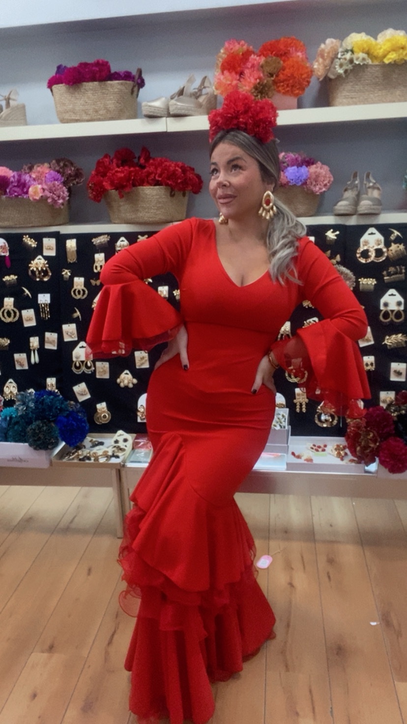 Vestido de crespón elástico , con volantes y detalles de tull en mangas y falda , este vestido lo podéis observar como queda con enaguas y sin enaguas . No tiene cambio ni devolución