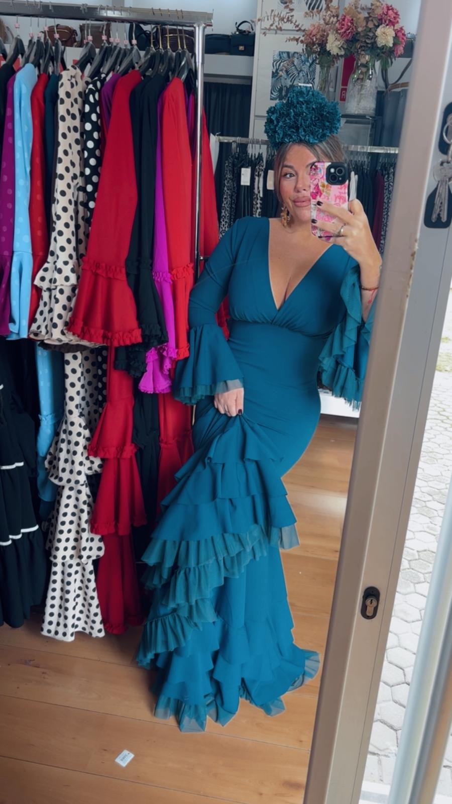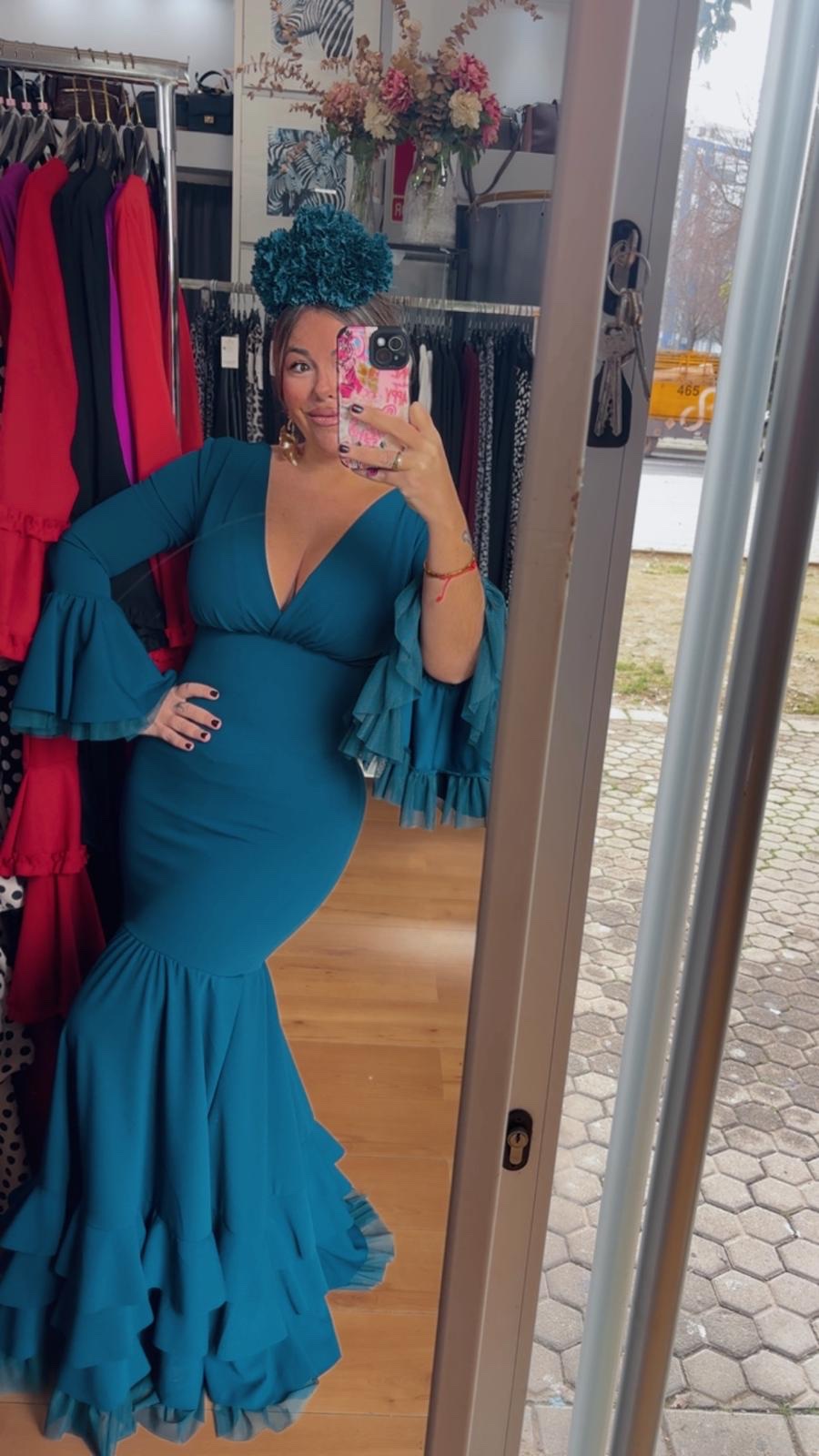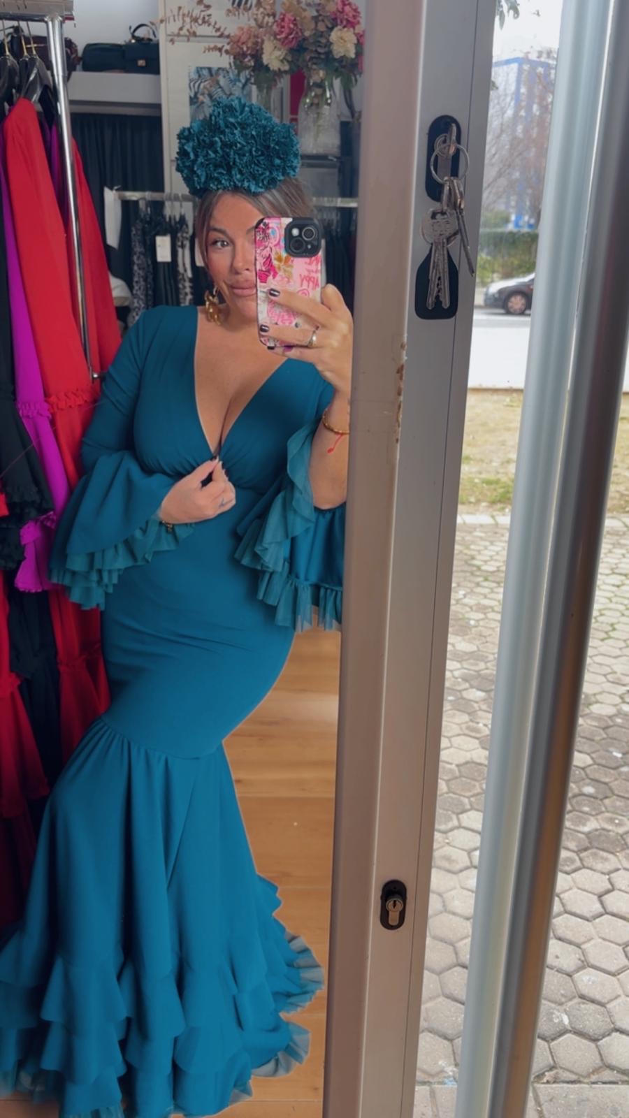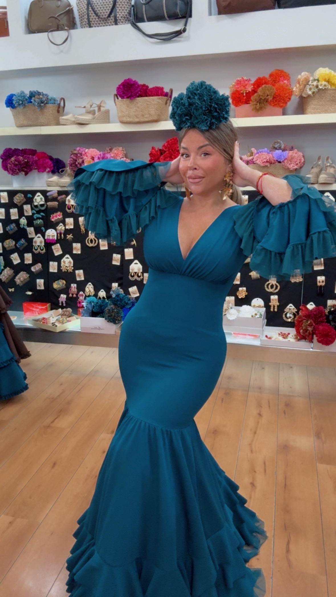 Vestido crespón elástico , color petróleo , y lleva tull, , (la modelo lleva Cancan sin aro ), los artículos de flamenca no tienen cambio ni devolución